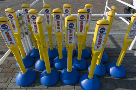 黄色い駐車禁止のポールが沢山立っている ストックフォトの定額制ペイレスイメージズ